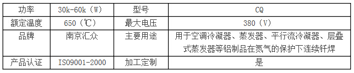 本設(shè)備在氮氣氣氛的保護條件下,使用非腐蝕性釬劑,連續(xù)釬焊汽車用鋁質(zhì)熱交換器、水箱,汽車空調(diào)平行流冷凝器,蒸發(fā)器等鋁質(zhì)件的釬焊。